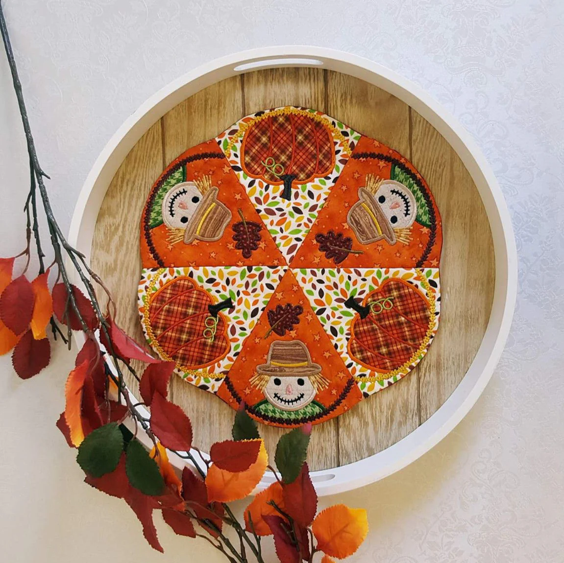 This is a table centre or round placemat for Autumn/Fall or any time of the year made in the hoop. Designs for the 5x5, 6x6 and 7x7 hoops are all included (You can make the 5x5 in the 5x7 hoop, the 6x6 in the 6x10 hoop etc.)