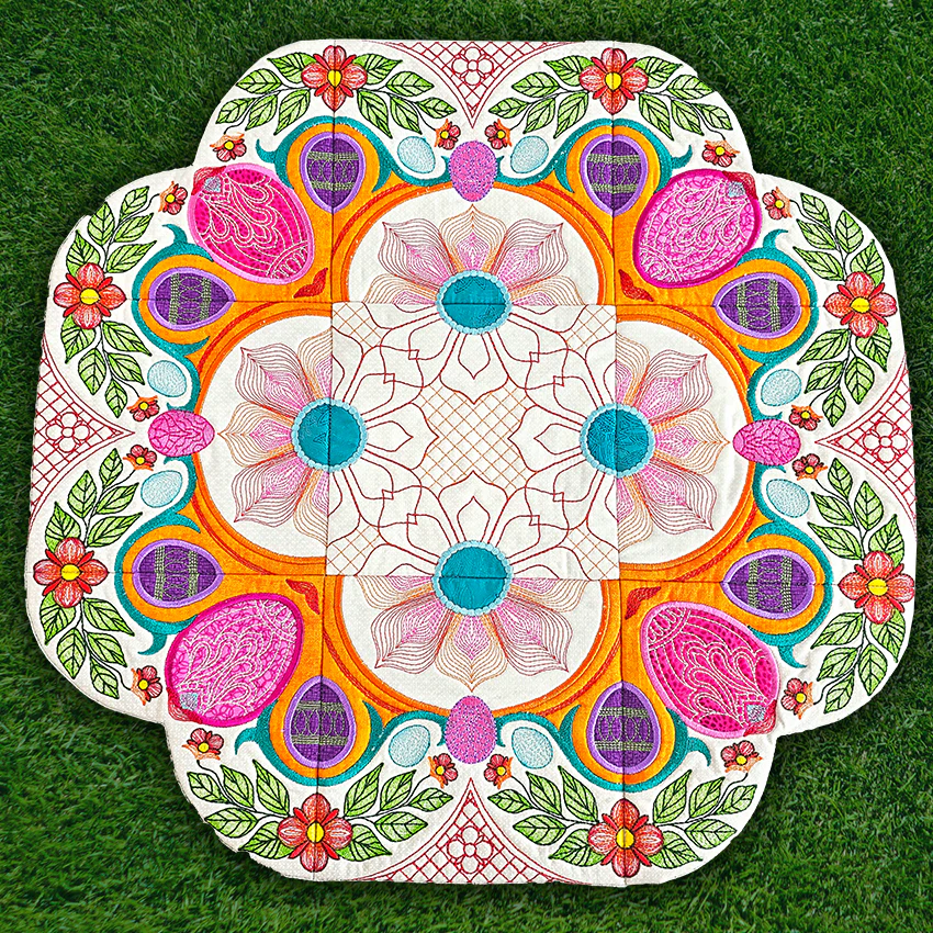 This gorgeous Spring Party Topper or Runner is perfect for any table regardless of the season. The design features vibrant colours with a flourishing, leafy design. It can be made in the 4x4 5x5, 6x6 or 7x7 hoop size. This is an ITH in the hoop machine embroidery design.